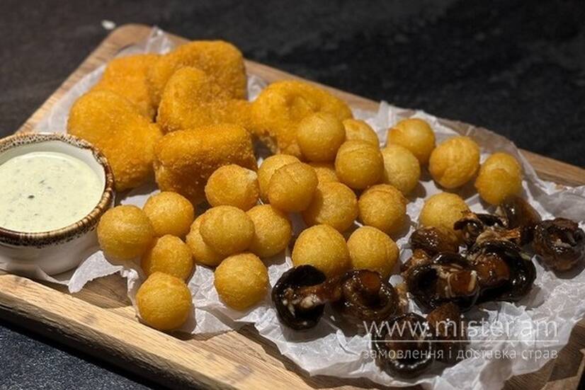 Нагетси, картопляні кульки, печериці обсмажені (подаються в соусі барбекю). Соус тар-тар