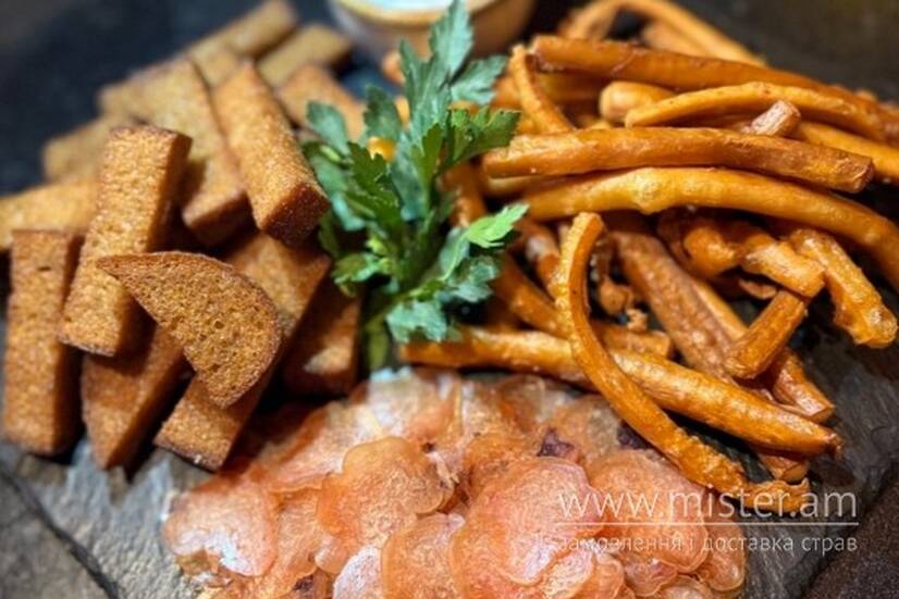 Ковбаса сирокопчена "Кролик з журавлиною", сир Чечіль смажений, сухарики з сірого хліба. Подається зі сметанно-часниковим соусом.