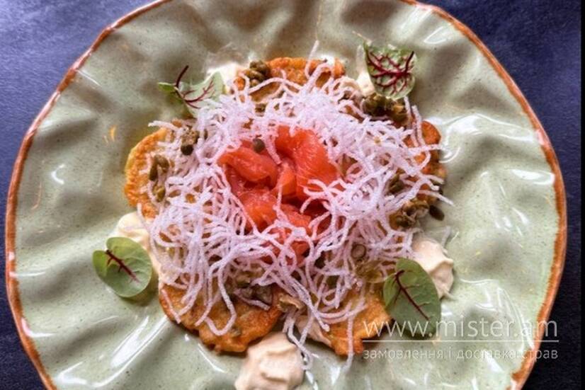 Смажені каюачкові оладки, слабосолений лосось. Подаються з вершково-гірчичним мусом, каперсами та смаженою фунчозою.