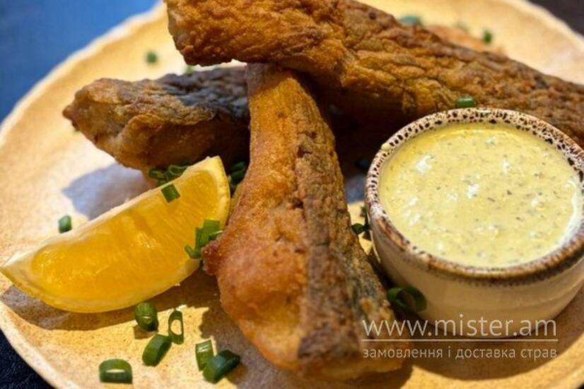 Короп смажений. Подається з соусом тар-тар, лимоном та зеленою цибулею. Мінімальне замовлення 200 г.