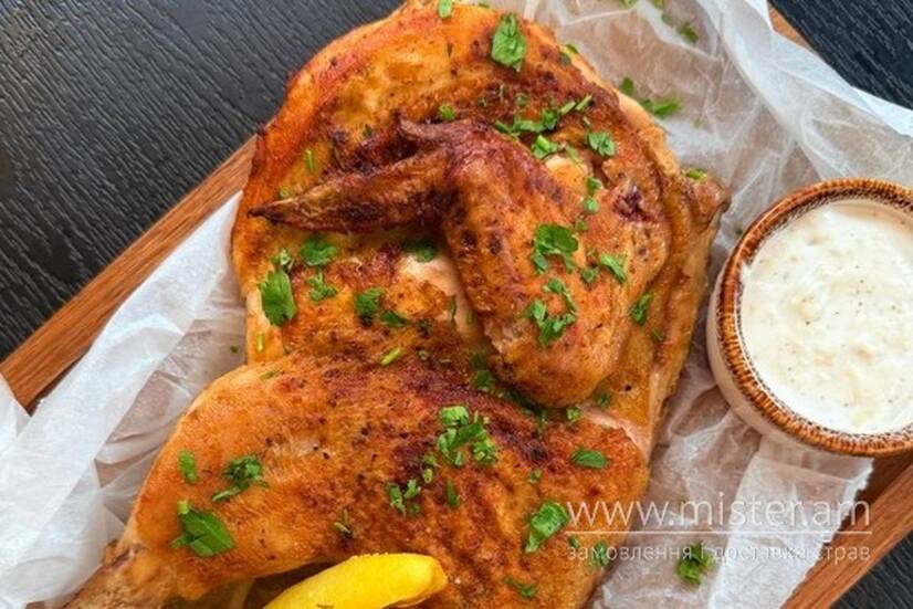 Смажене курча. Подається з вершково-часниковим соусом та картопляними діпами.