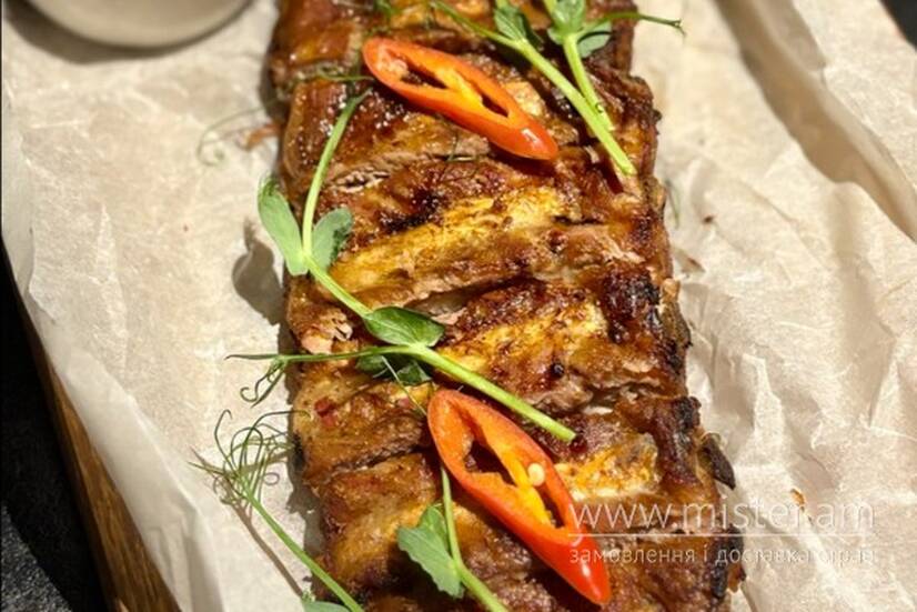 Реберця (свинина) у імбирному маринаді. Подаються з соусом Ворчестер.