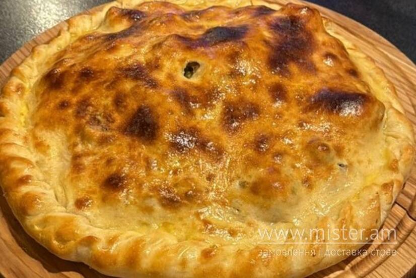 Шашлик з курячого стегна та вирізка зі свинини. Подається запеченим в тісті з помідорами черрі та зеленню.