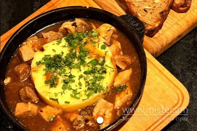 Картопляне пюре, гуляш зі свинини, соус демігляс. Подається з житнім хлібом з насінням та перекрученим салом.