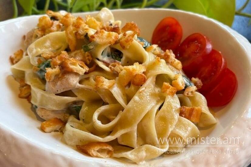 Паста Fettuccine зі смаженою курячою грудкою, шпинатом та в`яленим томатом у вершковому соусі. Подається зі смаженим сиром сулугуні та томатами черрі.