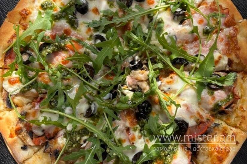 Тісто власного виробництва, балик, печериці, маслини, соус Цезар, соус Песто, крем-сир, руккола, томати, оливкова олія.