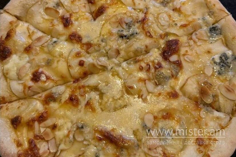 Тісто власного виробництва, сирний соус, сири Моцарелла, Дорблю, Пармезан, мигдалеві пластівці, груша та мед.