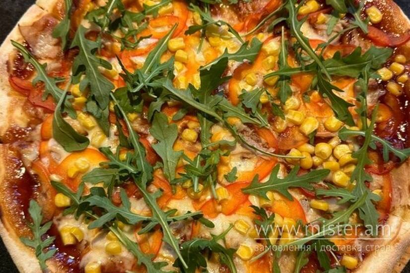 Тісто власного виробництва, соус Барбекю, сир Моцарелла, копчена куряча грудка, болгарський перець та кукурудза. Подається з рукколою.
