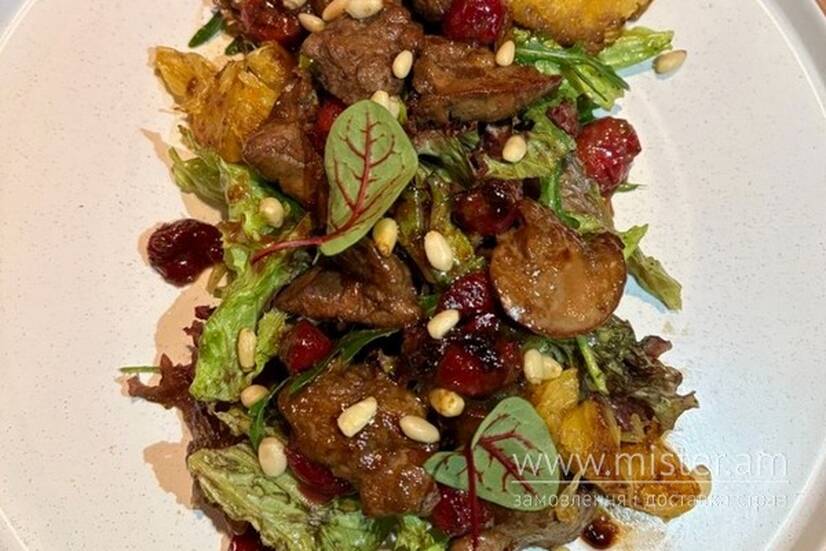 Карамелізована куряча печінка у поєднанні з вишнею та філированим апельсином, мікс салату з м`ятно-імбирною заправкою та кедровим горіхом
