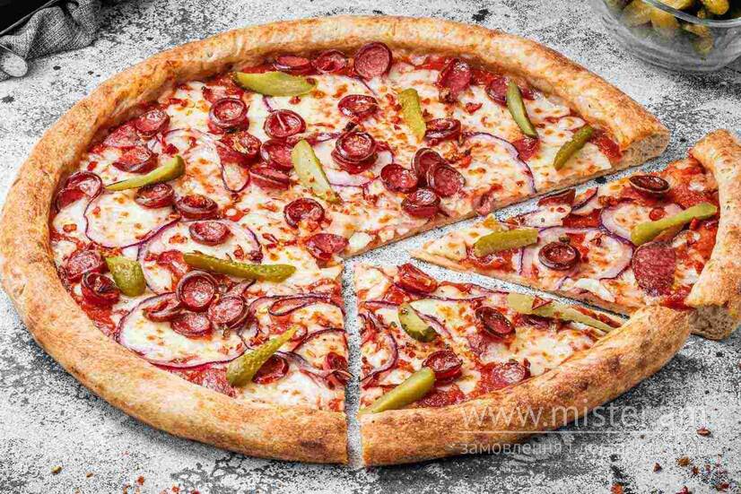 Сир моцарела, мисливські ковбаски, огірки мариновані, цибуля червона, паприка, томатний соус. Основа: крафтове борошно, пшеничне борошно, закваска, оливкова олія, цукор, сіль.