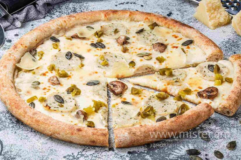 Сир моцарела, купати, гриби печериці мариновані, перець халапеньйо, сир пармезан, насіння гарбуза, соус вершковий. Основа: борошно пшеничне, борошно крафтове, закваска, олія оливкова, сіль, цукор.