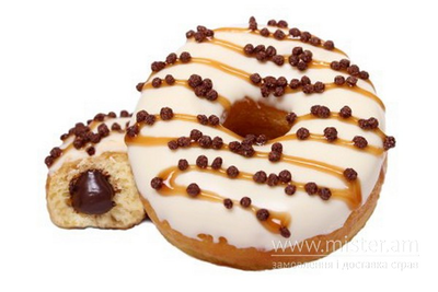 Донат приготовлений за технологією GSK (США). Начинка зі смаком капучино. Покритий ніжною шоколадною глазур`ю. Прикрашений кульками кріспі.