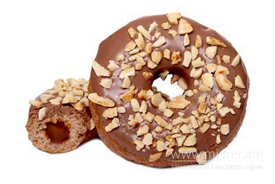 Донат приготовлений за технологією GSK (США). Начинка зі смаком карамелі. Покритий ніжною шоколадною глазур`ю. Прикрашений натуральним арахісом.