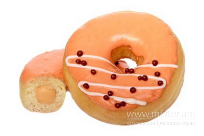 Донат приготовлений за технологією GSK (США). Начинка зі смаком дині. Покритий ніжною шоколадною глазур`ю. Прикрашений кульками кріспі.
