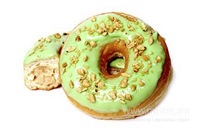 Донат приготовлений за технологією GSK (США). Начинка зі смаком арахісу. Покритий ніжною шоколадною глазур`ю. Прикрашений натуральним арахісом.
