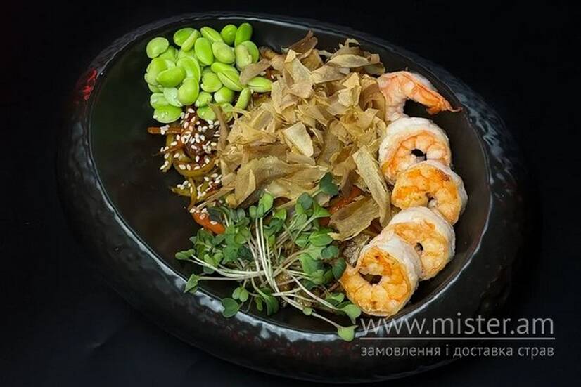 Локшина яєчна, боби Едамаме, креветки, стружка тунця, мікрогрін, унагі, болгарський перець, морква, печериці.