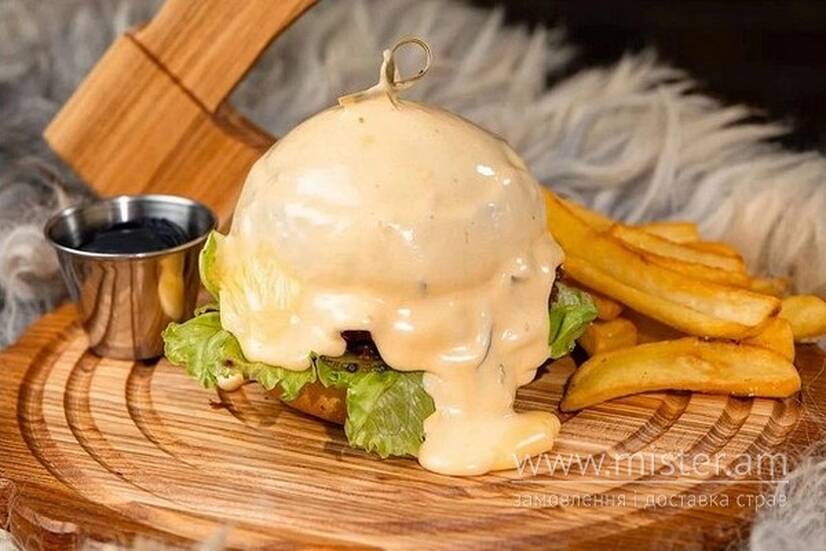 Бургер подається на підсмаженій булочці бріош, з рваною свининою обсмаженою в кисло-солодкому соусі, карамелізованою цибулею на листі салату з маринованим огірком та потрійнім сиром та картопляними діпами.
