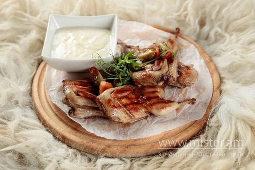 Соковита перепілка смажена на грилі, подається з ніжним вершково-пармезановим соусом з додаванням часнику.
