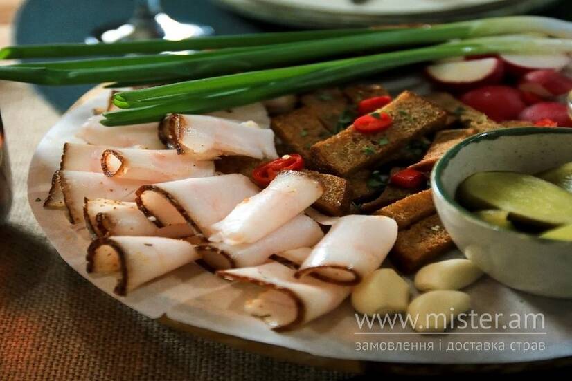 Сало, ковбаса, редис, малосолоний огірок, грінки, гірчиця, часник, хрін та зелена цибуля.