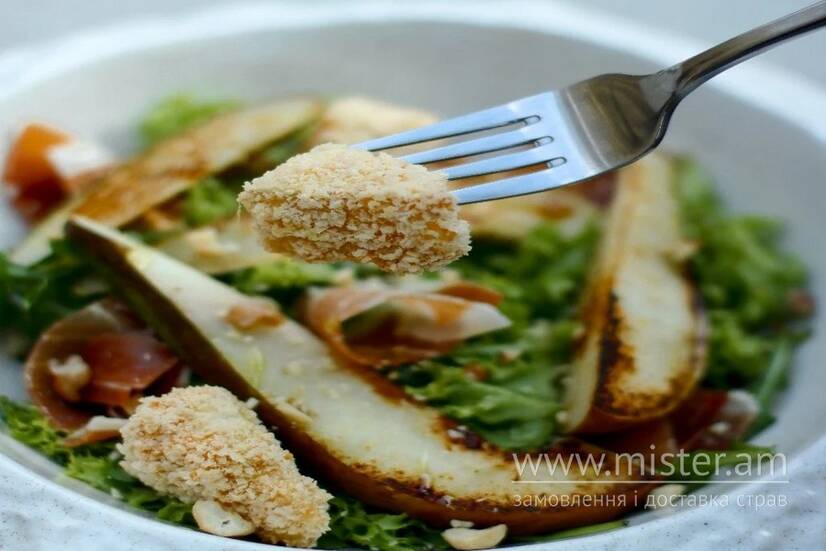 Мікс салату, хамон, груша, камамбер фрі, соус.