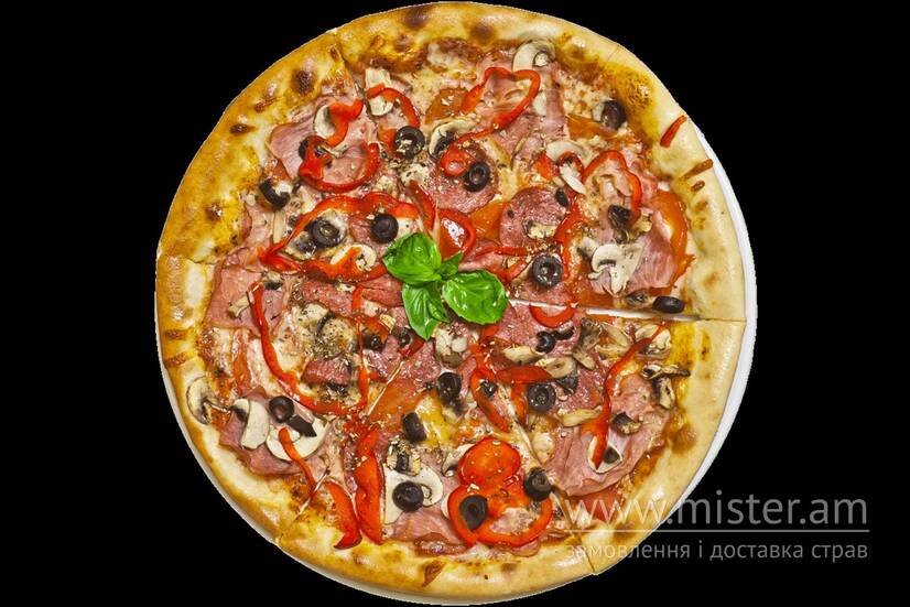 Тісто, сир моцарела, бекон, мисливські ковбаски, салямі, гриби, перець, оливки.