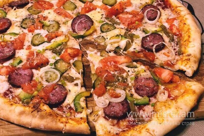 Тісто, сир моцарела, баварські ковбаски, мисливські ковбаски, червона цибуля, солоний огірок, соус BBQ.