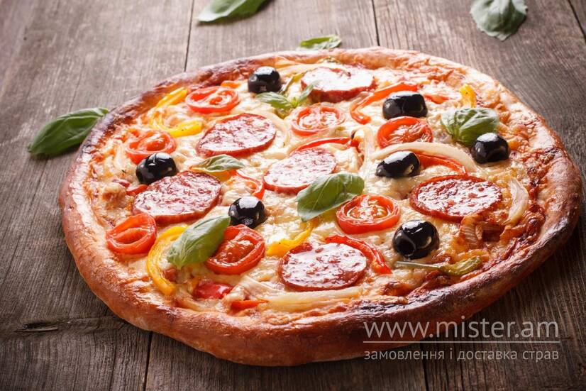 Тісто, соус Італійський, сир моцарела, салямі, помідори, базилік, оливки.