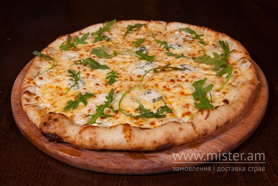 Тісто, оливкова олія, сир моцарела, крем-сир Каліфорнія, сир чедер, пармезан, рукола.