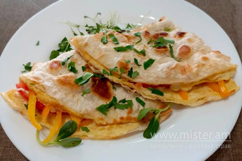 Яйце, лаваш, сир Моцарела, перець болгарський, зелень, помідори.