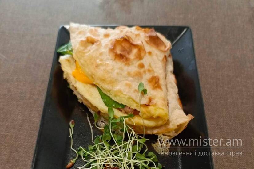 Яйце, лаваш, шпинат, сир тостовий, помідори, тунець, мікрогрін.