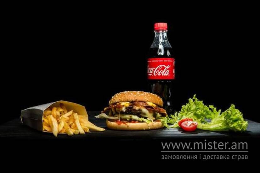 Бургер із свинною котлетою + картопля фрі L + напій (0.5 л)