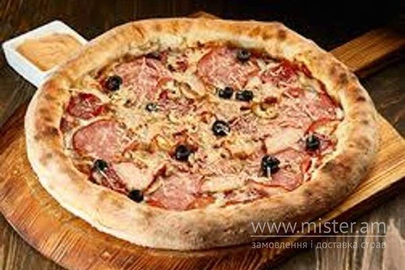 Тонке тісто, соус BBQ, сир Моцарела, бекон, шинка, мисливські ковбаски, синя цибуля, маслини.