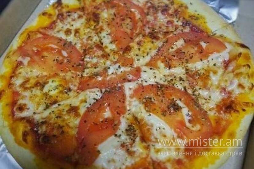 Тісто, соус Італійський, сир Моцарела, сир Моцарела в розсолі, томати, базилік.