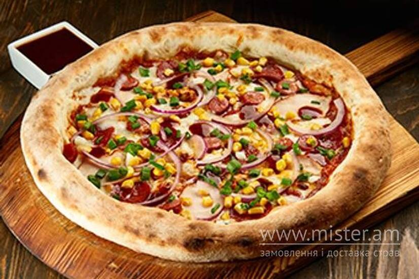 Тісто, вершковий соус, сир Моцарела, курка, ананаси, петрушка, кукурудза маринована, перець, соус фірмовий Масо.