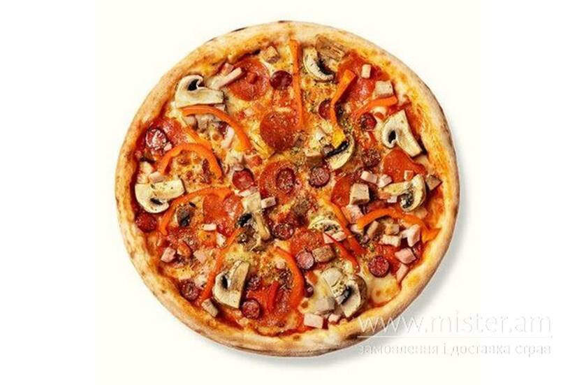 Тісто, сир Моцарела, бекон, салямі, мисливські ковбаси, гриби, перець, оливки, томатний соус.