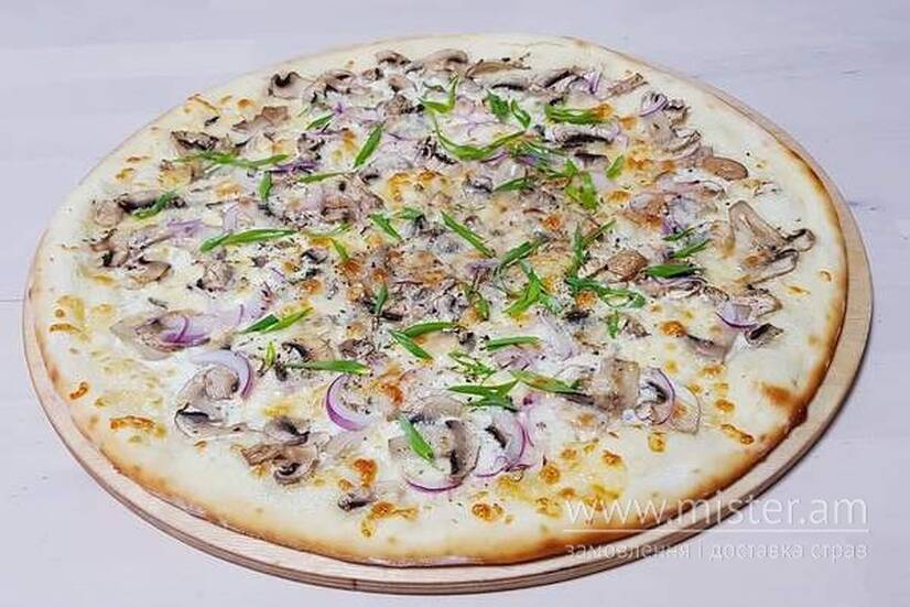 Тісто, соус Бешамель, сир Моцарела, куряче м'ясо запечене на грилі, гриби, маринована червона цибуля, зелень.