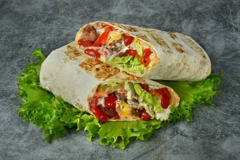Куряче м`ясо приготоване на мангалі, овочі гриль: баклажан, солодкий перець, помідор, цибулька, грибочки; тонкий лаваш, соус.