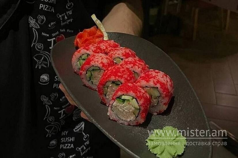 Сніжний краб, сир вершковий, ікра корюшки, огірок свіжий, майонез гострий.