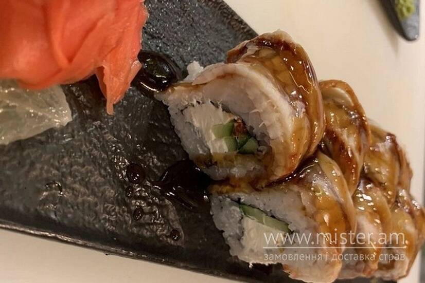 Вугор, сир вершковий, ікра корюшки, огірок свіжий, соус унагі.