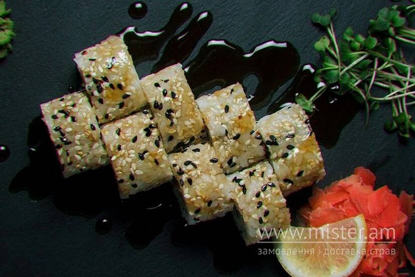 Лосось, сир вершковий, майонез гострий, авокадо, кунжут, цибуля зелена.