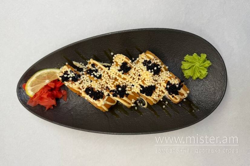 Рис для суші, норі, сир вершковий, авокадо, креветка, лосось, майонез гострий, соус унагі, ікра корюшки, кульки рисові, імбир маринований, васабі, лимон.