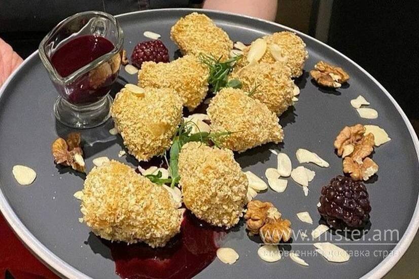 Сир камамбер, сухарі паніровочні, ягоди, горіх грецький, пластівці мигдальні, ягідний соус, зелень.