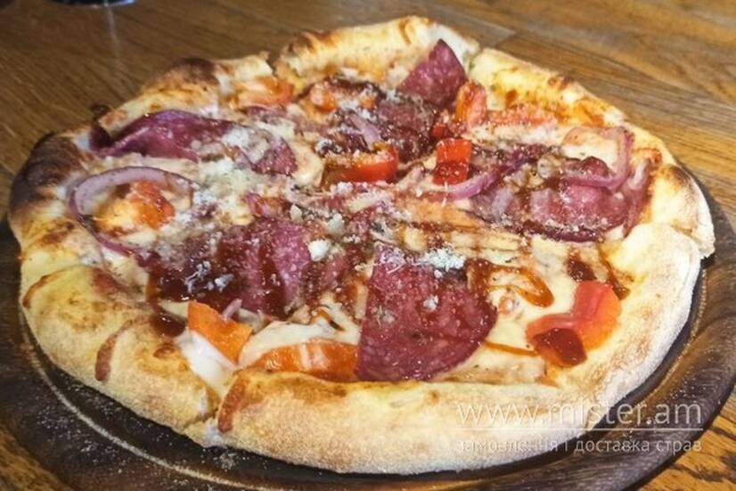 Тісто, соус фірмовий, сир моцарела, соус часниковий, салямі, перець болгарський, цибуля синя маринована, соус BBQ, пармезан.