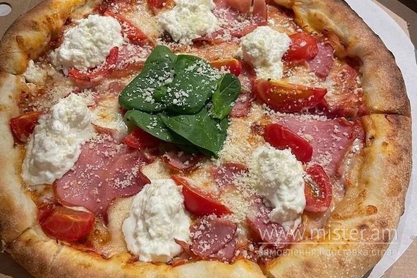 Тісто, соус фірмовий, шинка, помідор, сир моцарела, сир страчатела, пармезан