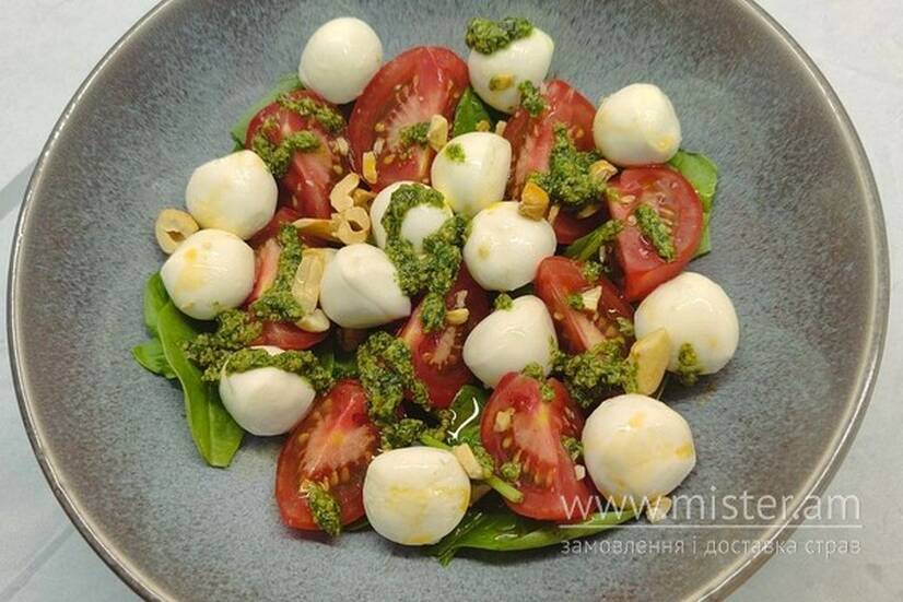 Сир моцарела міні, помідори чері, олія оливкова, соус песто, горіх, шпинат свіжий.