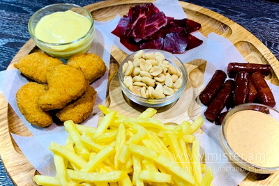 Курячі нагетси, бастурма, картопля фрі, мисливські ковбаски, горіхи, соуси.