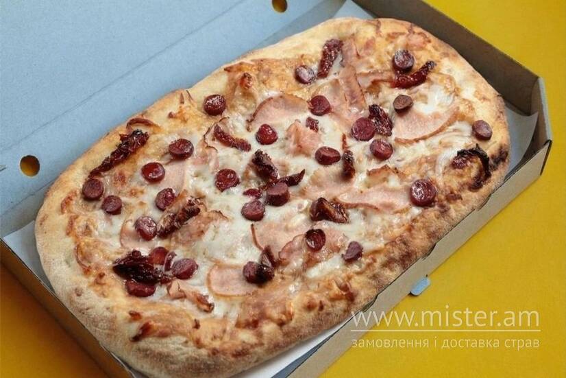 Вершковий соус, соус барбекю, сир моцарела, балик, бекон, мисливські ковбаски та в`ялені томати.