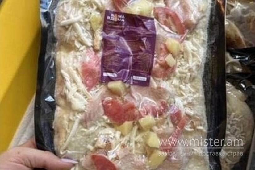 Заморожена піца. Вершковий соус, сирний соус, сир моцарела, запечене куряче філе, бекон, шинка, ананас, томати.