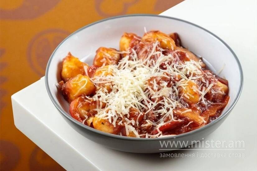 Італійські картопляні галушки з баликом, беконом та болгарським перцем в томатному соусі з додаванням соусу барбекю та солодкого чилі. Прикрашаємо цибулевим кранчем та пармезаном.