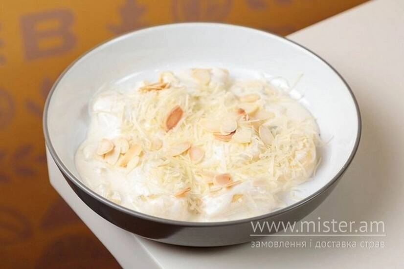 Італійські картопляні галушки з сиром дорблю, сиром брі та пармезаном в вершково-сирному соусі. Прикрашаємо мигдалевими пластівцями.